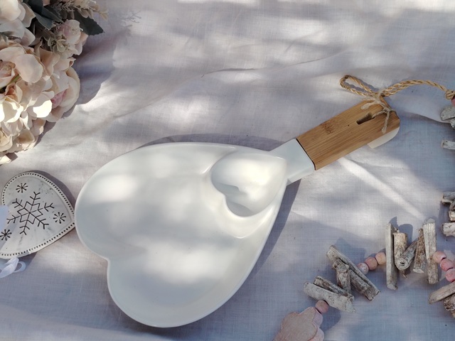 Ref.3185 : plato aperitivo de cerámica color blanco crudo con mango de madera (largo : 36 cm, alt : 3,5 cm, peso : 630 g)