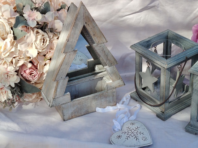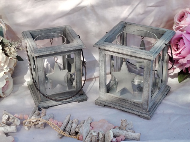 Ref.3195 : 2 faroles de madera gris y cristal (15 cm x 15 cm x 18 cm, peso : 385 g y 13 cm x 13 cm x 17 cm, peso : 275 g)