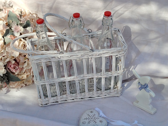 Ref.3182 : porta-botella de mimbre blanco con 3 botellas de cierre hermético (34 cm x 14 cm x 35 cm, peso : 1,9 kg)
