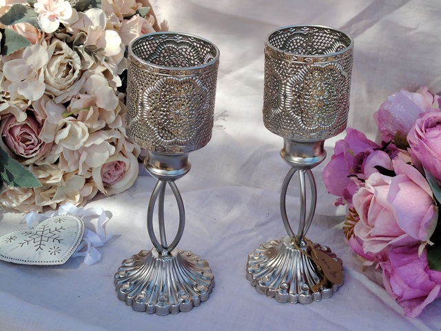 Ref.3137 : 2 porta-velas de metal blanco décapé y cristal (alt : 10,5 cm, diámetro : 9 cm, peso : 145 g)