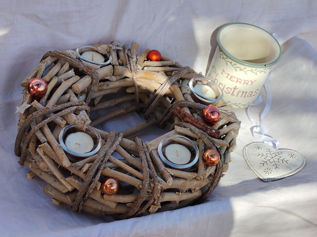 Ref.3197 : centro de mesa navideño de madera natural y cristal (alt : 11 cm, diámetro : 34 cm, peso : 1 kg)