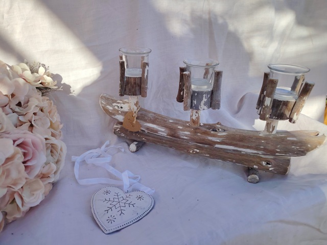 Ref.3184 : porta-vela rústico de madera décapée (alt : 21 cm, largo : 45 cm, peso : 1,2 kg)
